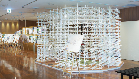 Student tea room designs are collected for the 130th Anniversary Architectural Culture Week Student Grand Prix 2016 Ginchakai Tea Rooms hosted by the Architectural Institute of Japan and the best submissions are displayed each year at Ginchakai. The submission awarded the gold prize will be constructed in full scale for the exhibit at Ginza Terrace on the 9th floor of Ginza Mitsukoshi Department Store again this year, and will be used as actual tea rooms. Enjoy a highly original tea room space uniquely created by a student.