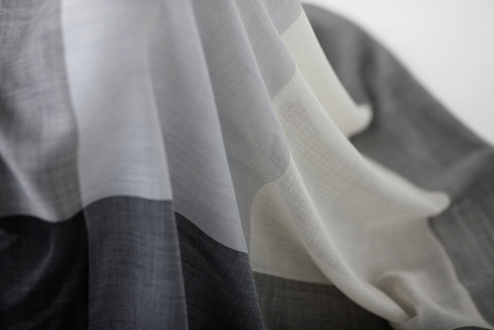 米沢織の高度な技術が生み出す、透け感が美しいブロックチェック柄のストールです。