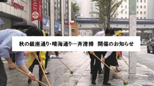 ※本日の一斉清掃ですが、天候の急変により各支部会や各店の判断で中止いただいて構いません。(10月4日8時47分更新) 「秋の銀座通り・晴海通り 一斉清掃」を行います 毎年、春と秋の2回、銀座通り・晴海通り沿道のお店ではいっせいに、歩道の清掃を行っています。朝9時から約30分間、お店の社...