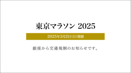 東京マラソン当日、銀座では交通規制が実施されます。お車でいらっしゃるかたのアクセスや、歩行者の皆さまにご不便をおかけいたしますが、何卒ご協力をお願いいたします。 ※交通規制の詳細については、マップ(PDF)をダウンロードしてご覧いただけますので、ご活用ください。 実施要領 開催...