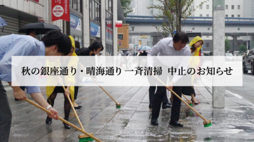 10/7の「秋の銀座通り・晴海通り 一斉清掃」は中止いたします。 「秋の銀座通り・晴海通り 一斉清掃」を行います 毎年、春と秋の2回、銀座通り・晴海通り沿道のお店ではいっせいに、歩道の清掃を行っています。朝9時から約30分間、お店の社長さん、店長さん、従業員さんが一緒になってデ...